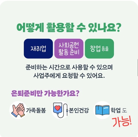 이 기간 동안 퇴직을 준비하거나, 재취업, 사회공헌 활동, 창업 준비, 건강관리, 자기계발 등을 할 수 있도록