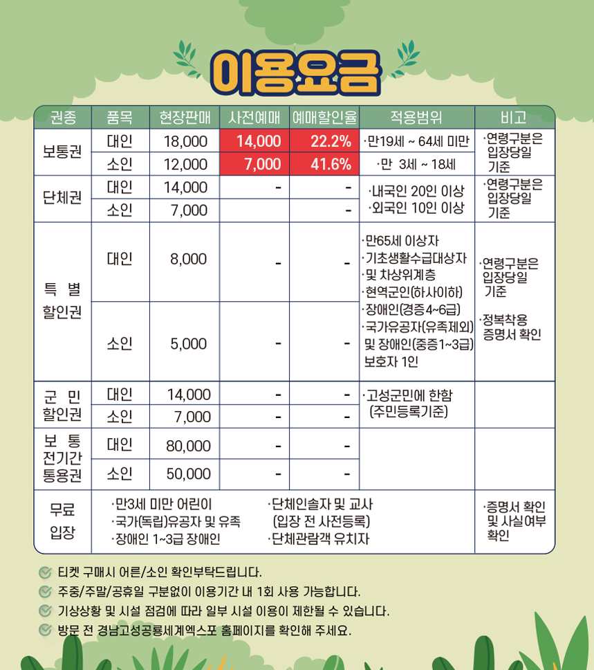 ● 사전 예매와 관계없이 특별할인 대상자 또는 고성 군민은 할인된 가격으로 입장권을 구매할 수 있습니다.