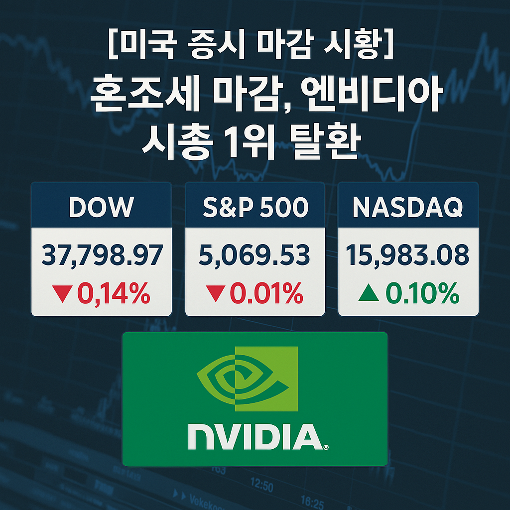 나스닥은 엔비디아의 강세 덕분에 상승세를 유지했지만, 다우존스는 경기 방어주와 전통 산업주의 약세로 100포인트가량 하락했습니다.