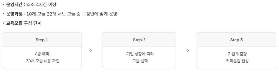 운영시간은 최소 4시간 이상이며, 기업 교육과 연계도 가능합니다.