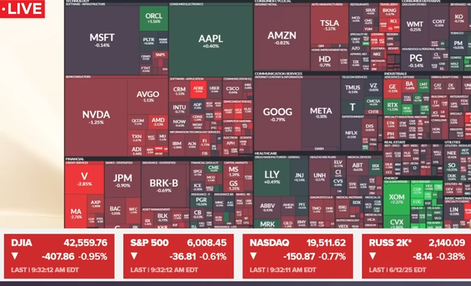 미국 증시 3대 지수는 개장 전 하락했으나 개장 직후 낙폭을 줄였습니다. 나스닥 -0.8%, 다우 -0.9%, S&P 500 -0.6%로 마감 전망. 금, 에너지, 방산 관련 자산은 상승, 여행·항공 등 소비 섹터는 하락했습니다.